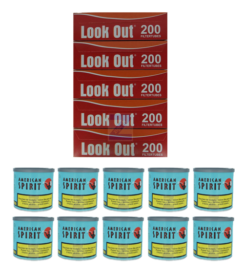 10 Dosen American Spirit à 70 g mit 1000 Filterhülsen LOOK OUT