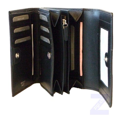 Inneneinteilung: 12 Kreditkartenfächer und 4 Innenfächer mit Druckverschluss, 1 Einsteckfach mit Sichtfenster für Bilder, 2 Geldscheinfächer, 2 Münzfacher mit 2 Kreditkartenfacher und 2 Innenfacher, 1 Mittlerer Reissverschluss mit Doppel-Münz-Innenfach, 1 Aussenfach
