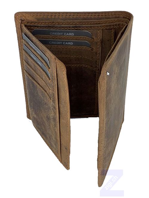 Die Inneneinteilung: 8 Kreditkartenfächer, 1 klappbares Einsteckfach mit Sichtfenster für Bild, 2 Geldscheinfächer, 1 Münzfach mit Druckverschluss